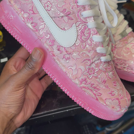 Modèle unique recouvert à la main d'un tissu brodé rose à motifs floraux.