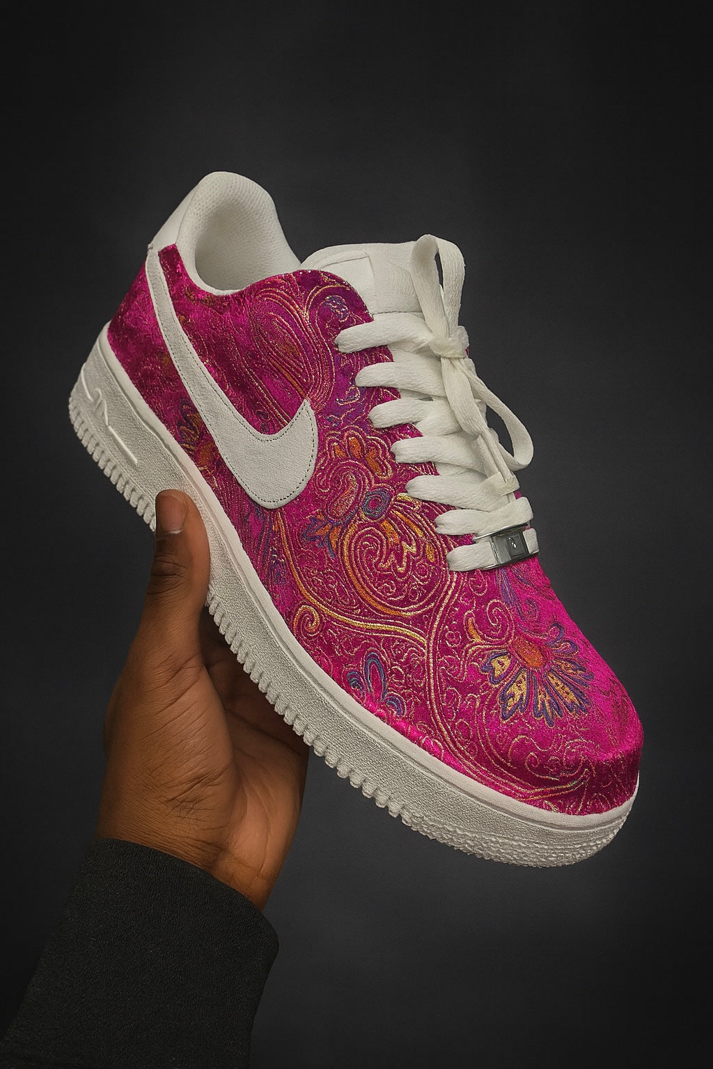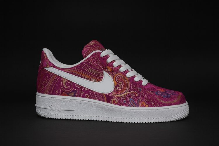 Cette paire unique de Nike Air Force 1 a été entièrement personnalisée avec un somptueux tissu brocart rose fuchsia, rehaussé de motifs floraux et arabesques multicolores pour un rendu à la fois élégant et audacieux.