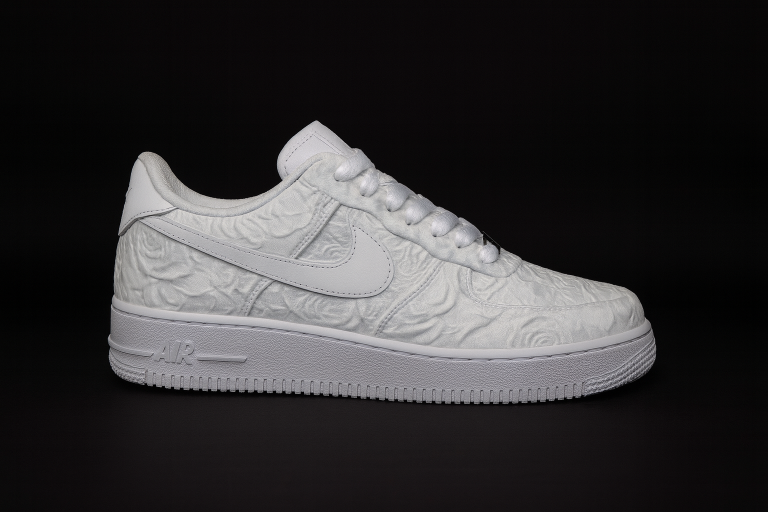 Sneaker Nike customisée à la main. Chaque paire est une pièce unique. Le motif floral embossé, travaillé avec précision, recouvre toute la silhouette blanche, et comprend la semelle.