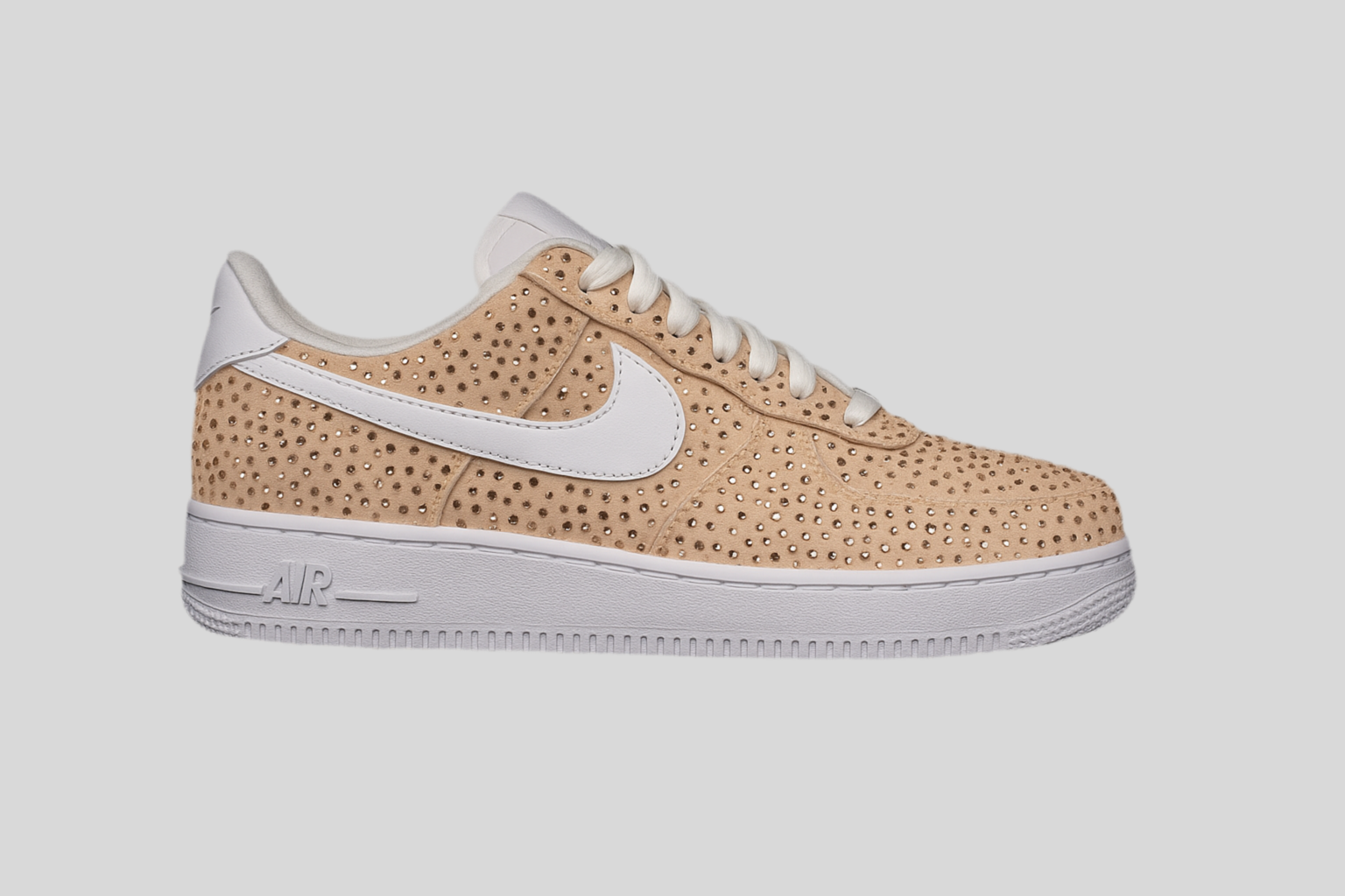Découvrez cette Nike Air Force 1 customisée à la main, entièrement recouverte de strass étincelants qui captent la lumière à chaque mouvement.