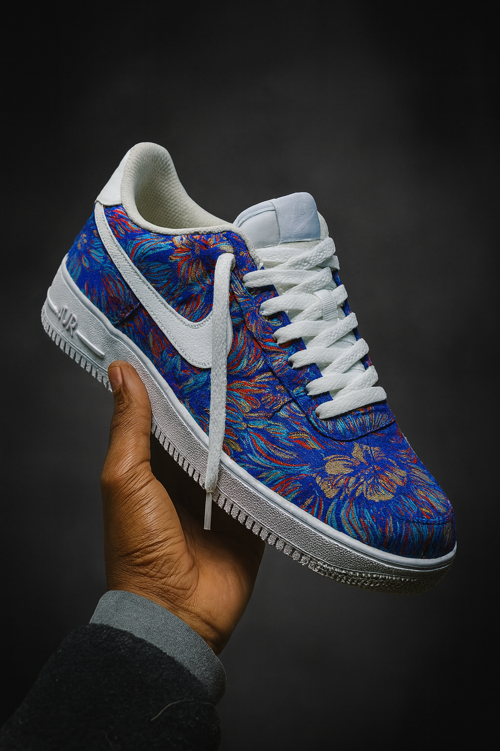 Ajoutez une touche d'élégance unique à votre style avec cette Nike Air Force 1 customisée à la main. Le tissu brocart bleu royal aux reflets rouges et dorés apporte un relief luxueux et une finition raffinée, tout en conservant le confort et la qualité de la célèbre silhouette Air Force 1.